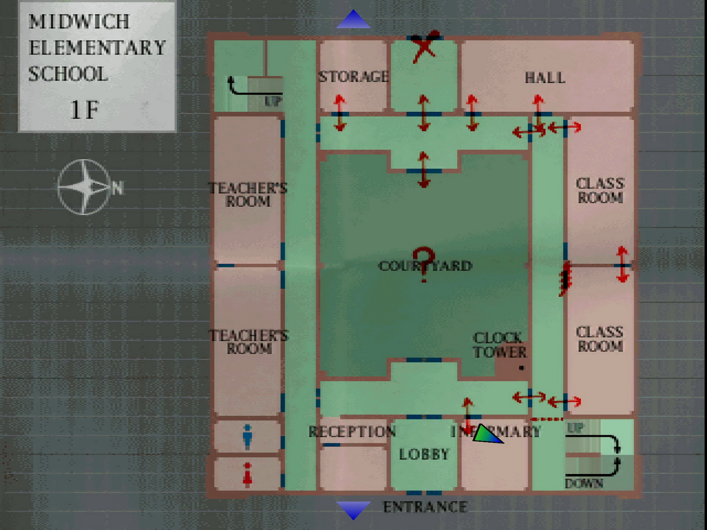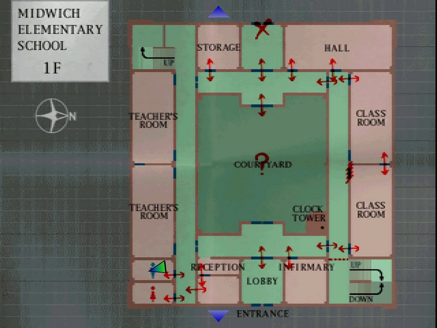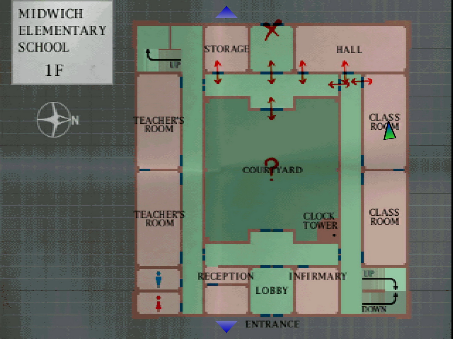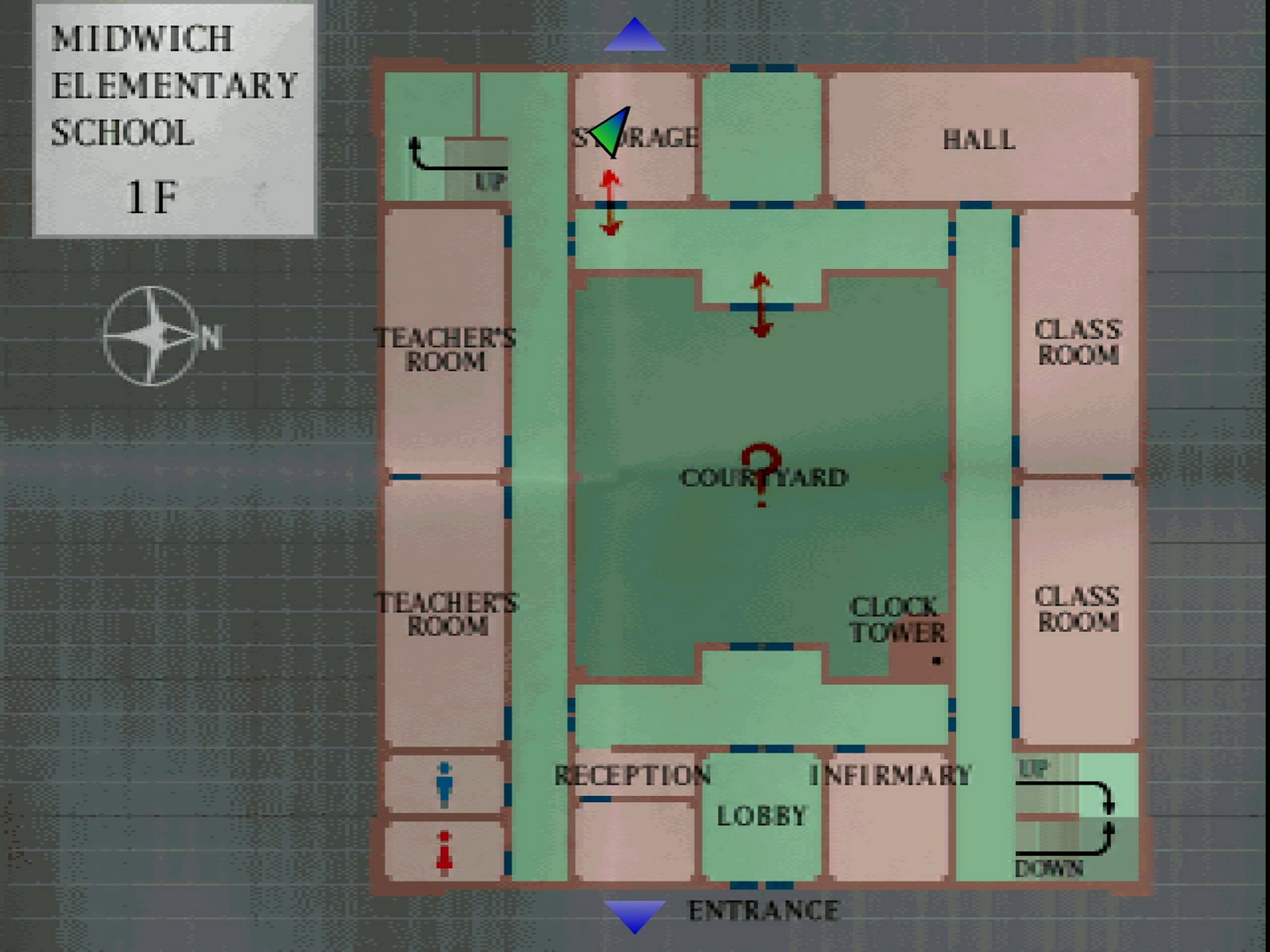 Note on school map: Still using the same map with north facing right, I'll continue using standard directions and descriptors for room and hall locations. First Floor Top HallwayCareful of Grey Children on either side, enter the Storage room on the left to find a pink 15 Rubber Ball on the back table. Inside the top unmarked hall beside the Storage are Handgun Bullets and a First Aid Kit on the benches near a giant fan. The left and right hall doors are locked so enter the marked "Hall" at the top right. Just inside you'll be ambushed by two giant roaches called Creepers (five on hard). Handle them with the Handgun or quickly run along the wall and through the other door to the right hall. First Floor Right HallwayConsider first unlocking the top hallway doors for later and enter the upper Classroom. Find the cards strewn across the table and take the green 16 Picture Card. There's a grate wall blocking the outside hallway so you'll need to continue through the next Classroom where you'll be swarmed by Grey Children. There's nothing else in here so consider bailing through the closer exit to Harry's far right. Now on the other side of the hall, grab the Health Drink on the nearby bench. The stairs are blocked off here so pass through to the bottom hall. First Floor Bottom HallwayThere's three more Grey Children in here so watch out. Enter the Infirmary on the left to find the next Save Point and First Aid Kit on the table and a Health Drink in the cabinet. This is also the only save point in this version of the school so take note of it. Back in the hall, the Lobby contains two Grey Children patrolling the outer perimeter while a hard-to-see Ampoule can be found on the wheelchair in the back right corner, which is the most powerful health item in the game. The exit doors won't open, so return to the hall and consider unlocking the courtyard doors for later use. With the left hall doors locked, kill the Grey Child by the Reception and enter the small room behind it.