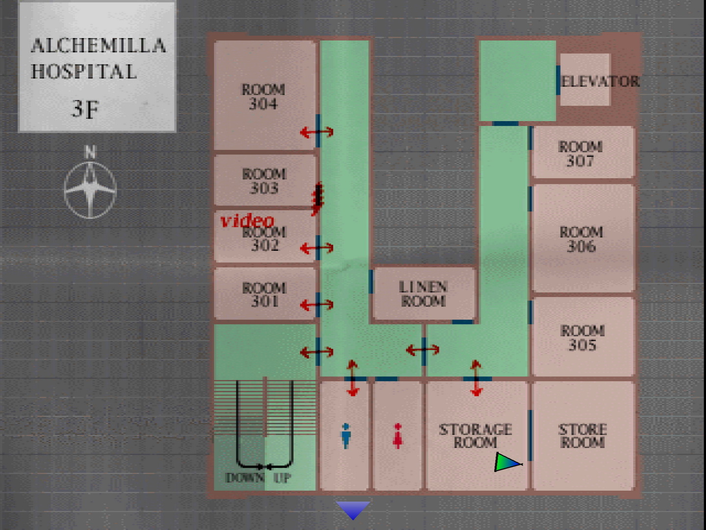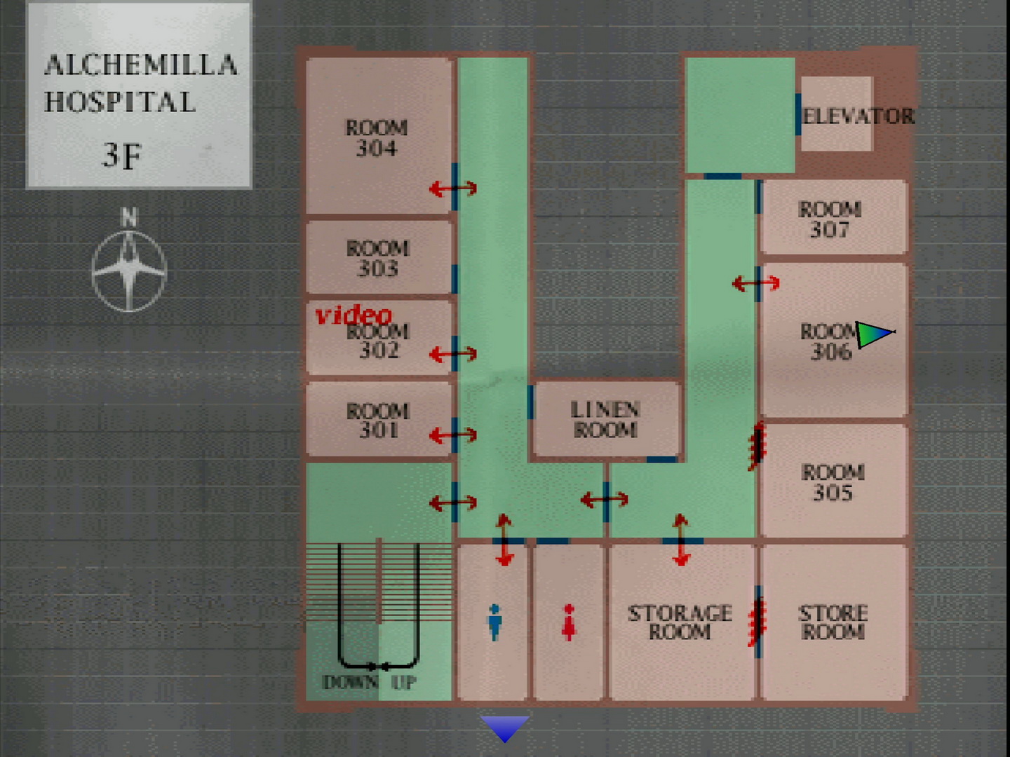 Only enter the first room on your left in the second hall if you feel like wetting yourself, but the first room on the right contains a 35 Video Tape guarded by a Nurse. You may remember a VCR in room 302 on the third floor where you can later return to view the Video Tape, but its recording is filled with static and hard to understand for the time being.