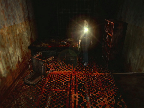 You may notice an apparition of Alessa just ahead along with her chuckling on the soundtrack. The room directly across from the elevator is straight from the antique shop, with a Save Point on the counter, a First Aid Kit on a chair and Shotgun Shells on the farther counter.