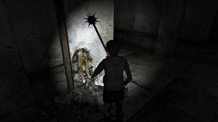 Pass through the other door in the hall to a larger room. Move ahead and around the right corner to notice a section of the wall that looks different from the rest, almost like the re-plastered walls from the first Metal Gear Solid... Equip the Pipe or Maul and smack it till the wall breaks, revealing a 20 Silencer and a pair of legs trapped in the wall... Perhaps some of Snake's handiwork? He must've dropped his SOCOM's silencer...