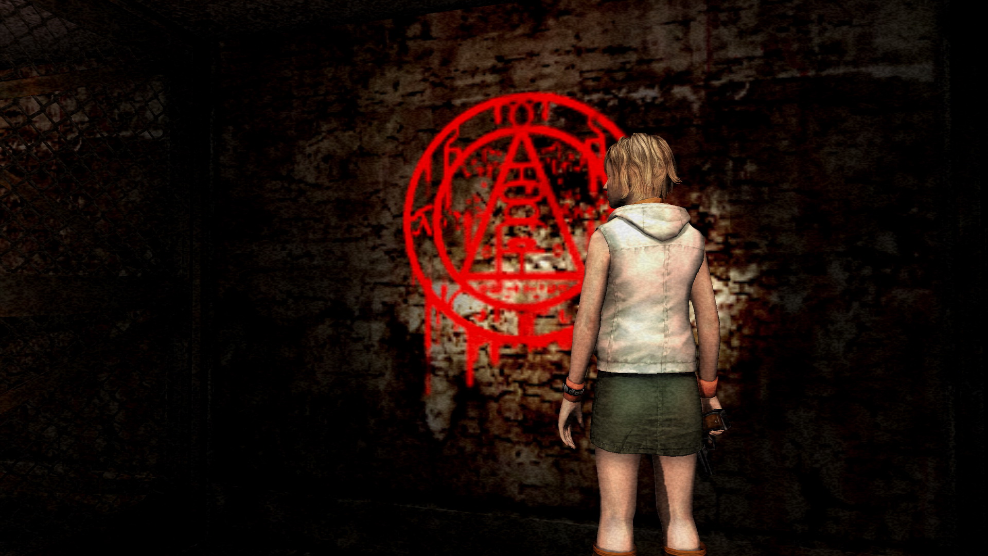Proceed through the second corridor just the same and inside the third you'll eventually reach a path where six gate doors will close behind you as one blocks you from the front. Examine the red symbol on the wall which isn't a save point but what was referred to as the "Mark of Samael" in the first Silent Hill. Examine it for a brief flashback of Lisa from that game, then proceed through the door down the newly-appearing hallway.