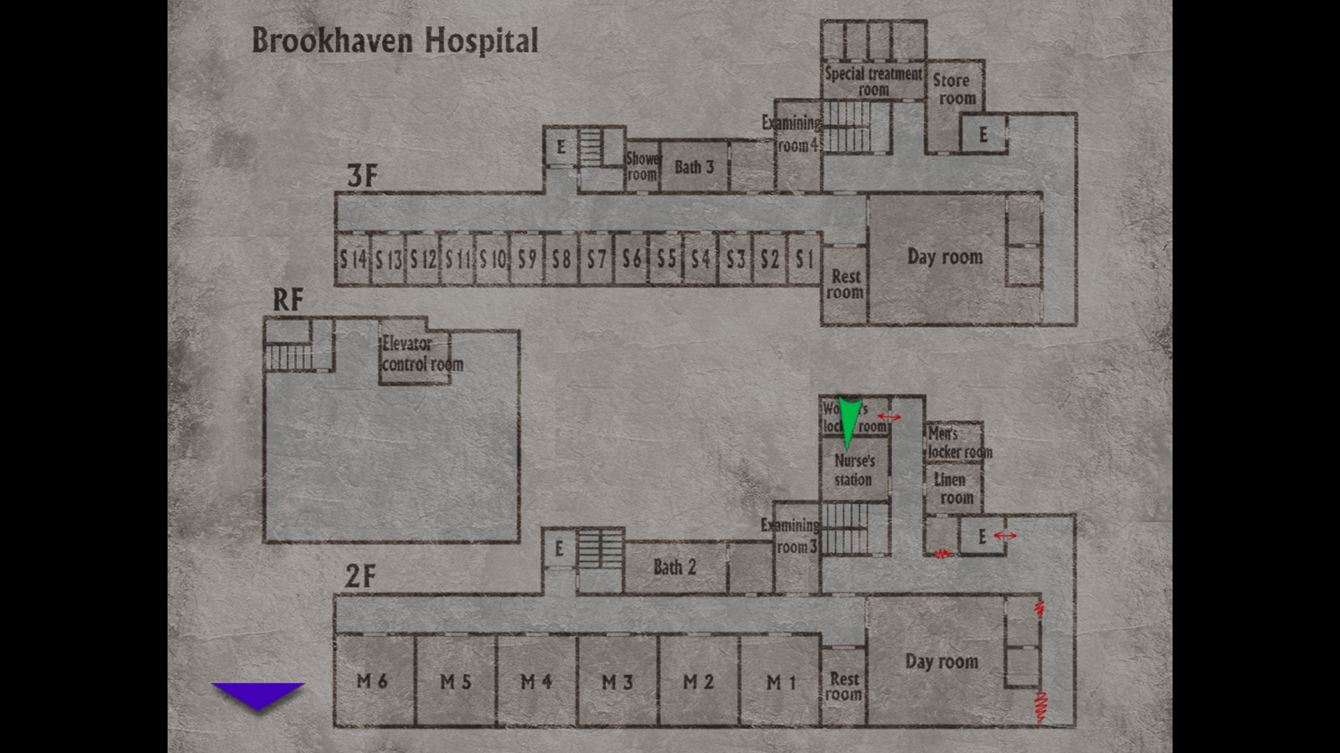 Enter the elevator and head back down to 1F since 3F's button won't work, then enter the patient wing.