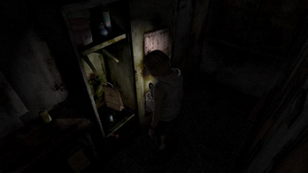 Enter the Storeroom through the nearby door. Find the blood smear by the shelf and Heather will think there could be something behind the shelf despite being unable to move it or get back there. Turning to your creative mind, use the Instant Camera to see what's back there.